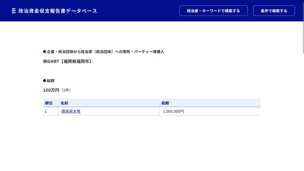 このデータベースで調べると、GHRT社は、検索できる範囲で、国民民主党本部主催の政治資金パーティーへの献金1回のみを行っていることが分かる。