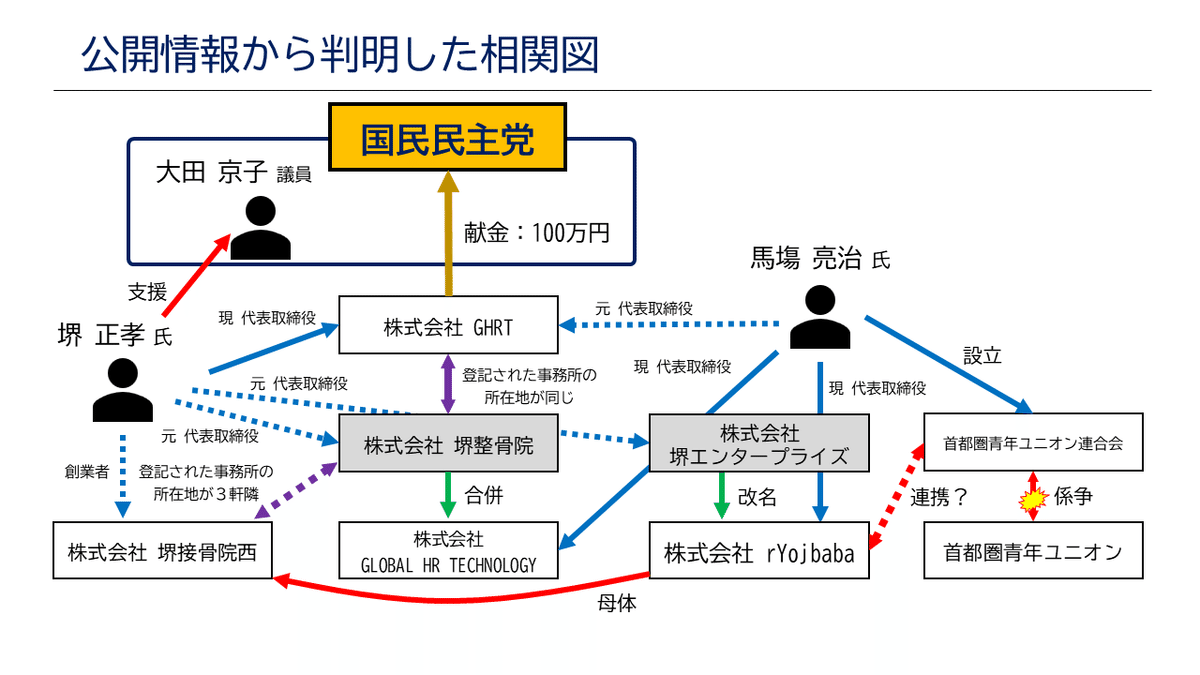 ここまで述べた通り、国民民主党に献金を行ったGHRT社を手掛かりに、会社や労働組合、士業法人などから構成される「堺・馬塲法人群」の存在が明らかになってきた。しかし、結局のところ、公開情報からは、一部の法人の活動の実態が掴めていない。