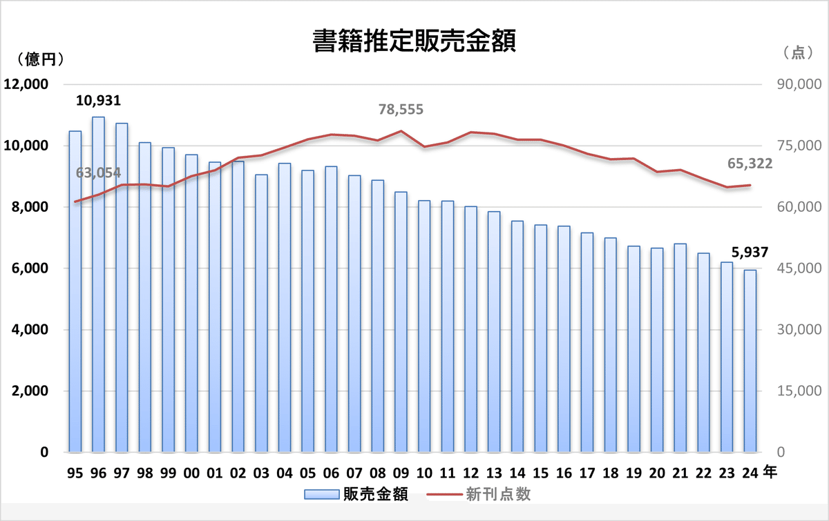 よって、「児童書と文庫を除いた書籍」は1995年の7600億円から、2024年の3250億円まで、58%の減少です。