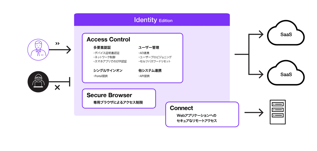 Identity Edition: 利用が急増しているSaaSへのアクセス制御とシングルサインオンで、従業員の安全な働き方を支えるアクセス管理を実現します。オフィスでもリモートでも同じIT環境を実現する基盤であり、最近話題のゼロトラストを構成する重要な要素です。オンプレミスのシステムも管理でき、IT担当者によるID管理の負担も軽減します。