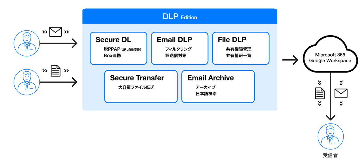 DLP Edition: 電子メールでやり取りする情報や組織内に散在するデータの、意図せぬ情報漏えいを防止します。PPAPと呼ばれる、セキュリティ上推奨されないメールの添付ファイルのやり取りから脱却するのを支援します。メールの添付ファイルを自動的にクラウドにアップロードし、セキュアにダウンロードできるようになります。 DLP(ディーエルピー)とは、Data Loss Preventionの略で、データ損失防止を意味します。
