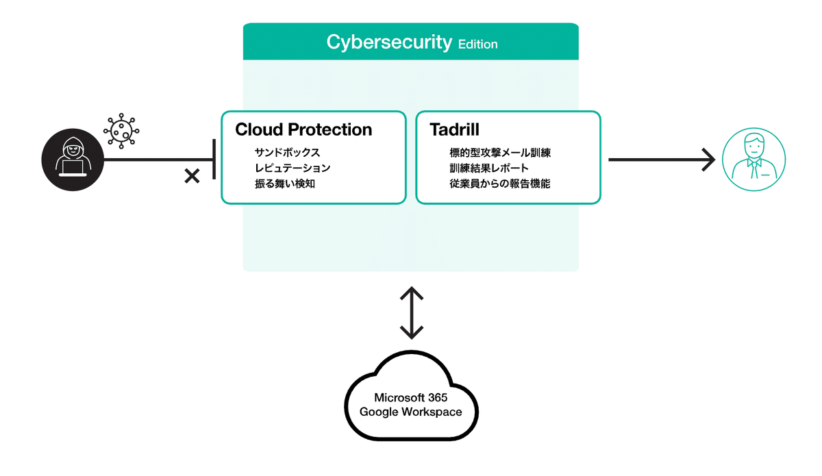Cybersecurity Edition: テクノロジー、人、プロセスの全方位で、組織をサイバー攻撃から守ることを目的としています。具体的には、ランサムウェアの起点となるような怪しい内容の電子メールを全従業員に送信し、対応を訓練するサービスが含まれます。組織全体のセキュリティに対する意識を、実態に即して把握し、PDCAを回していけます。 この訓練機能はTadrill(タドリル)と呼ぶサービスで、現場からの提案を後押しするHENNGEのチャレンジ精神から生まれました。