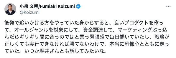 そもそも、フリマアプリというプロダクトでなければ小泉さんも入社したかどうかは分からなかったなと思い、やはり偉大になる可能性のプロダクトの種を創業者が作れているのか?という部分に帰着するなと思いました。