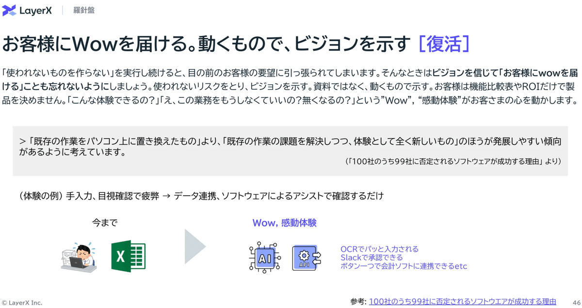 LayerXにおいて、意思決定の基準は基本的にお客様に価値(アウトカム)を生めるかです。新しいプロダクトや機能を作る時は、多くのお客様にヒアリングをしながら、作るものを考えます。