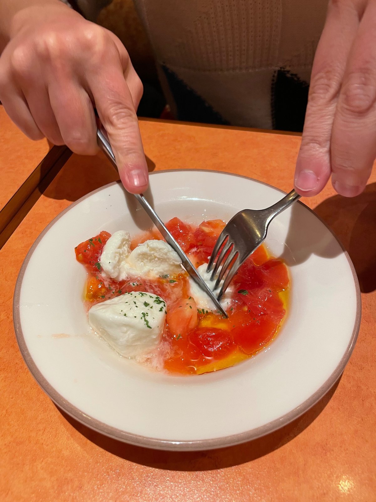 アロスティチーニを食べるときに必ず野菜も食べたくなる。イタリアではパンがないと食べるのがもったいない気持ちになる。そのときに、このアレンジは想像以上においしくて、今まで食べたアロスティチーニと野菜を新しい料理として再発見できたように感じた。