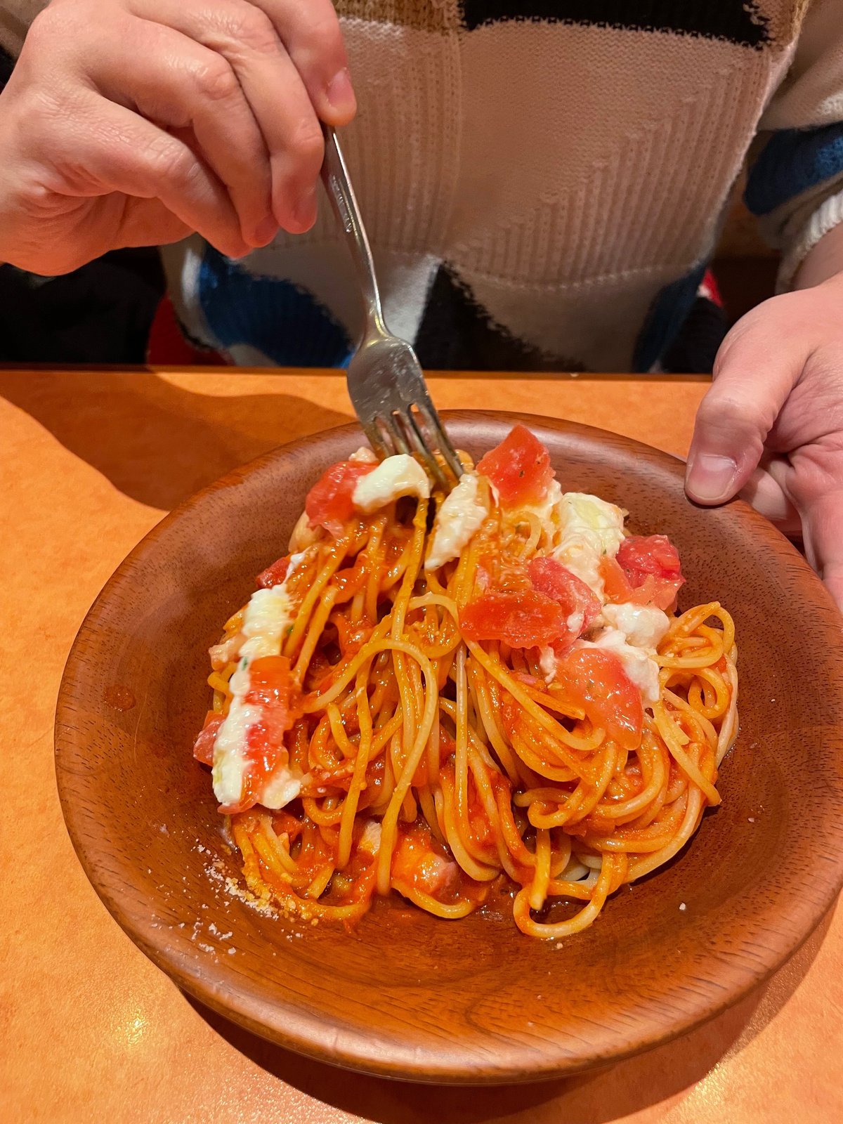 パルマ風スパゲッティはそのまま食べてもおいしいけど、フレッシュ感が欲しいときはモッツァレラトマトを加えるだけで、「なんだこれ!」となる。