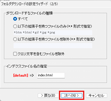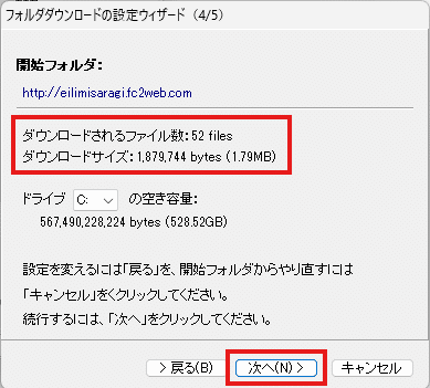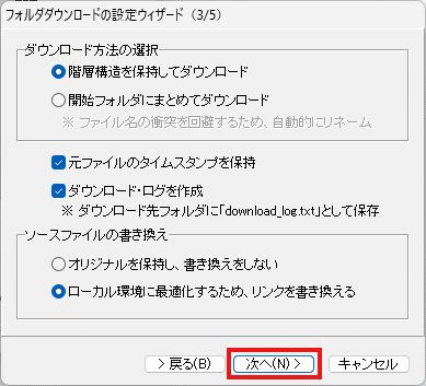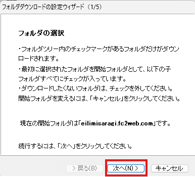 [フォルダダウンロードの設定ウィザード]が表示されるので、設定していきます。最初は[次へ]を押下。