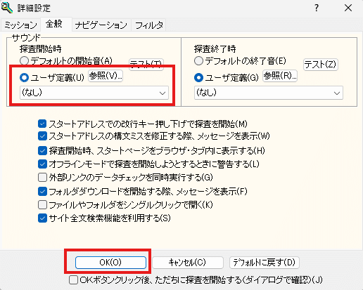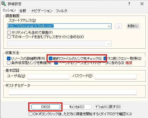 [詳細設定]ウインドウで[ミッション]>[収集方法]の項目で[動的ファイルのリンク先チェック]にチェックを入れ、[OK]を押下で設定完了です。