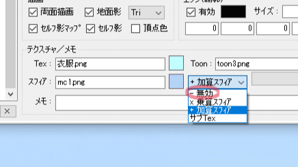 pmxeditorの編集ウィンドウ>材質>各材質のスフィアを無効に変更する。