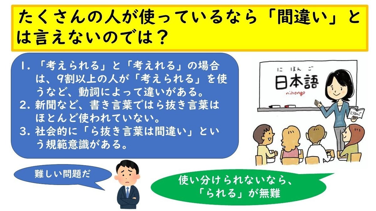 それから、社会の「規範意識」にも配慮する必要があります。現時点で社会的に「ら抜き言葉は間違いだ」という意識がある以上、改まった場面ではら抜きを使わないようにする人が多いでしょうし、非母語話者に日本語を教える時にも、「ら抜き」ではない形で覚えたほうが無難だからという判断もあるでしょう。友だちと話すときは「ら抜き言葉」を使ってもいいけど、改まった場面では使ってはいけないなど、使い分けを正しくしないといけないとなると、日本語が母語ではない人にとって非常に負担が大きくなります。