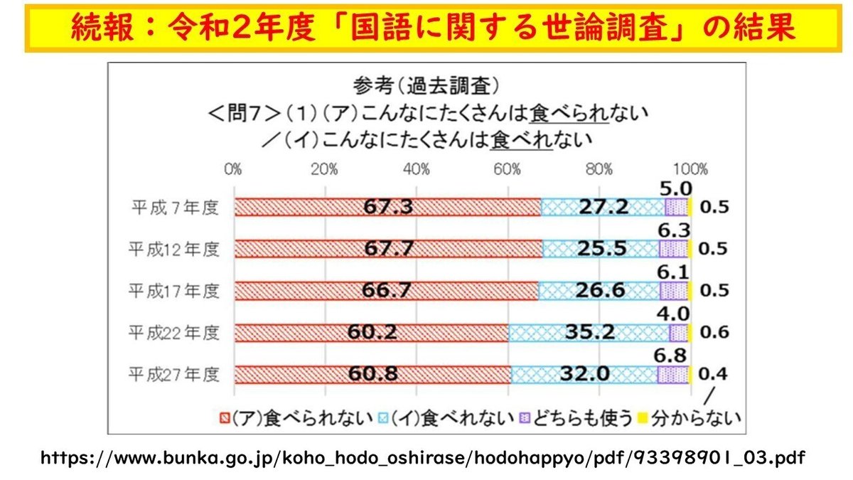 文化庁国語課という国の機関が「国語に関する世論調査」を毎年行っています。平成7年度の調査で「ら抜き言葉」についての質問がありました。たとえば「こんなにたくさん食べられない」と「こんなにたくさん食べれない」のうち、あなたはどちらを使いますかと聞いて、答えの割合を調査しています。
