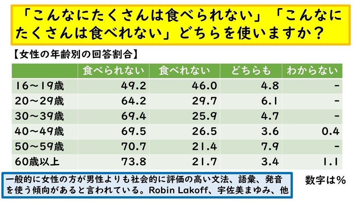 女性の方を見てみると、全体としての傾向は同じで、やはり年齢が低いほど「食べられない」を選んだ人の割合が高くなっています。先ほどの男性の回答割合と比べると、女性の方が「食べられない」を選んだ割合が男性に比べて高くなっています。数パーセントぐらいの違いですが、若干女性の方が各年代「ら抜き」ではない形を選んだ割合が高くなっています。これは、ことばとジェンダーの関係についての研究で明らかにされていることですが、一般に女性の方が男性よりも社会的に評価の高い文法形式を使うと言われています。つまり、女性の方が社会において正しいとされている形を使おうとする傾向があるということです。