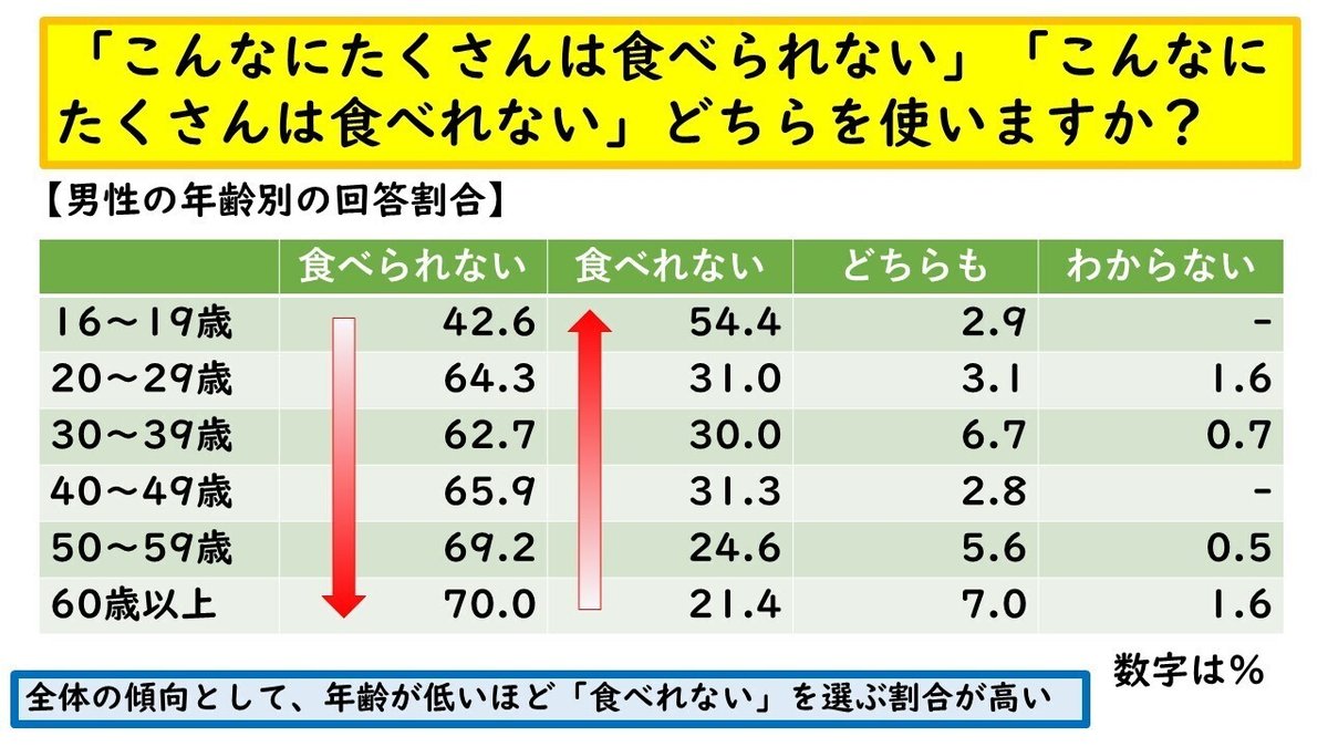 まず男性の方の年齢別の回答割合を見ていきます。「食べられない」と「食べれない」のどちらを使いますかという質問に対して、年齢別の回答割合を見てみると、全体として年齢が上がるにつれて「食べられない」の方を選ぶ割合が高くなり、年齢が低いほど「食べれない」を選ぶ割合が高いことがわかります。特に、10代では「食べれない」を選んだ人の方が割合が高くなっています。
