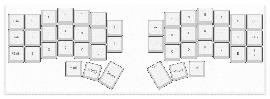 いま使っているキーボードはCorneです。配列自体は前回の記事とさほど変わらず、キーボードの配列に合わせて修飾キーを動かした程度です。