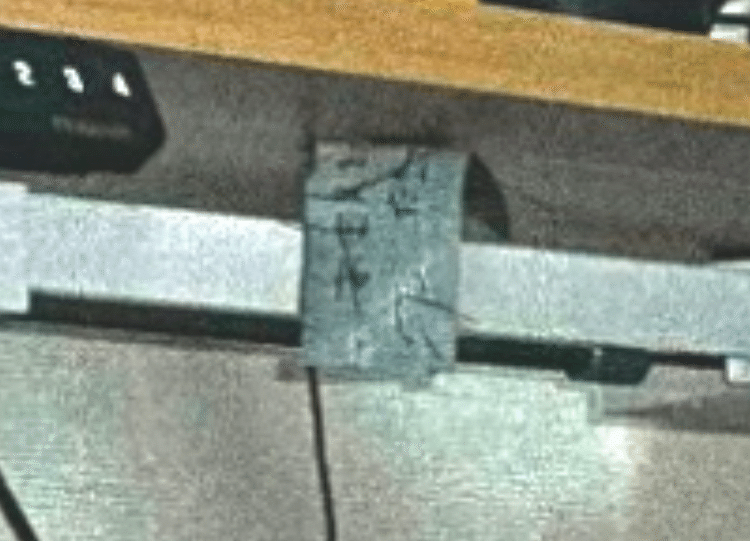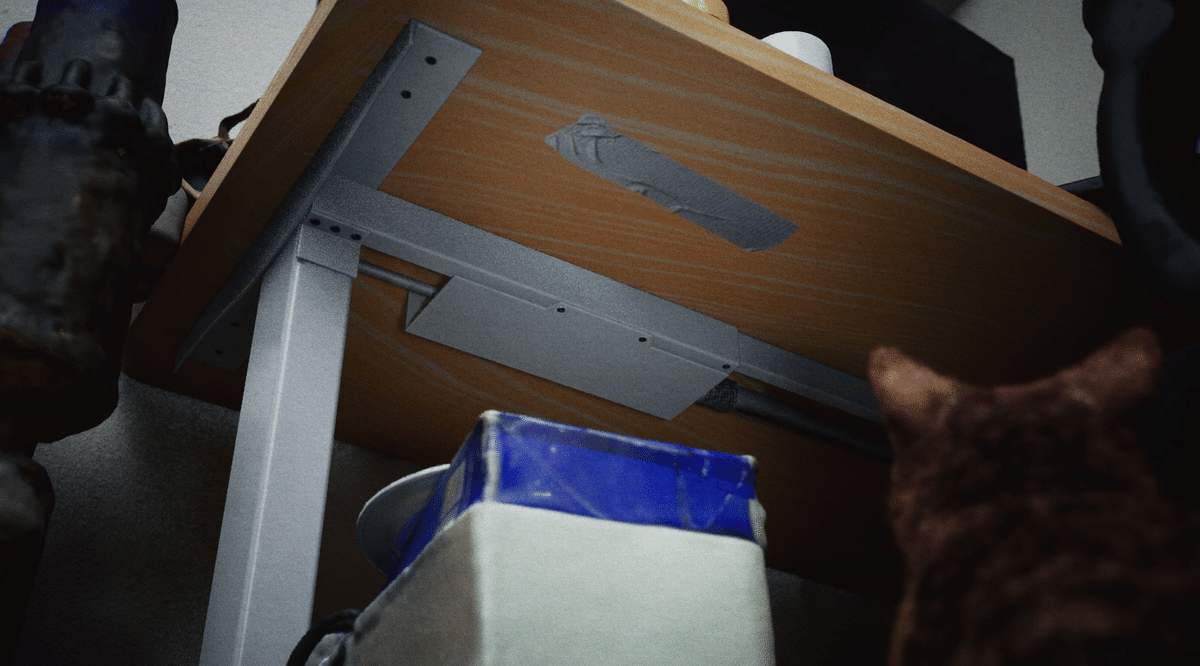 また、一足先にレビュー記事を読んだHが「なかなか意図が伝わらない」とぼやいたポストに添付されていた画像と、記事内の画像を見比べてみると、テーブルの下に張り付けられたガムテープ(?)がめくれているのが分かります。