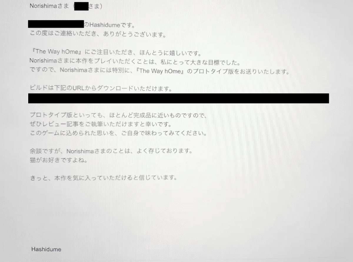 『The Way hOme』発表→ライターのNorishima(以下、N)がHashidume(以下、H)へ連絡を取る→Hは先行プレイを快諾、プロトタイプ版を送付→Nがプレイ後、レビュー記事を書く