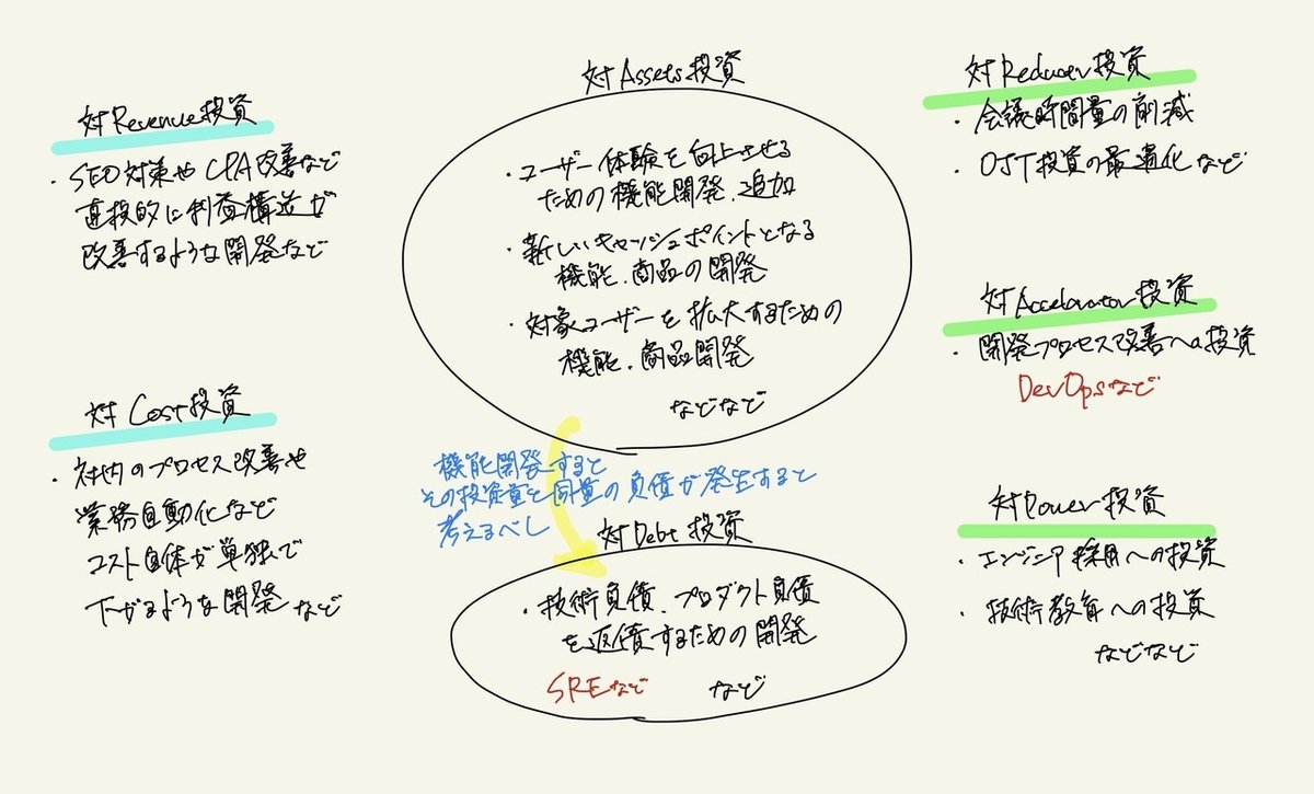 対Revenue投資、対Cost投資は上記のように「金のなる木」を作るとか、作り続けるために必要な投資ではなく、SEO対策やCPA改善の施策など、当該プロダクトのユーザー体験を大きく改善させるためのものではない、フロー的な投資を意味します。また対Cost投資に関しては、プロダクトそのものよりも社内の業務改善機能開発など、プロダクトの本丸以外の社内人件費の抑制などにアプローチするような投資も含みます。