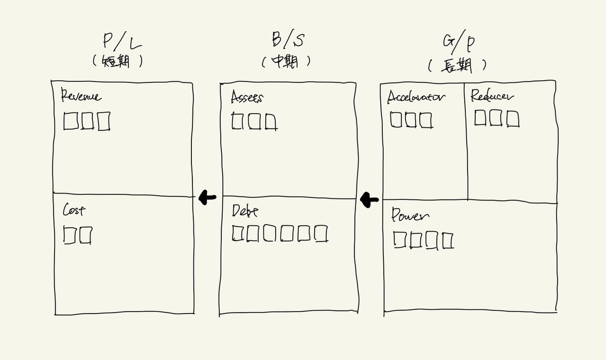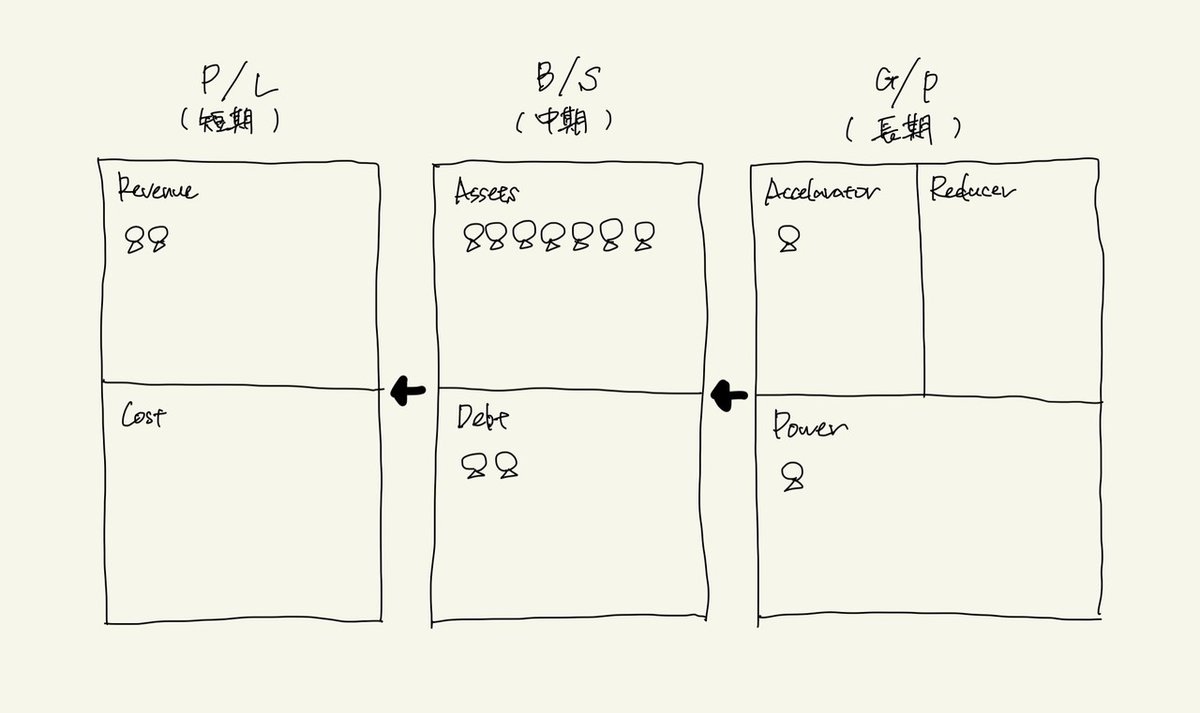 G/Pというのは先日のnoteで説明した通りですので一度目を通していただけると幸いです。P/Lはいわゆる財務三表の「損益計算書」、B/Sは「貸借対照表」になります。簡単に言えばB/Sは収益を生むための資産(プロダクトなど)であり、P/Lはその資産が(人的なコストも加味した上で)生み出す収益になります。ITでビジネスをする場合は「収益を生むための資産」、つまりソフトウェア的なプロダクト自体を作り続ける宿命にあるため、G/Pで定義された「生み出し続ける力」=「流量」もビジネス上重要な投資カテゴリとなります。うっかり流量が0になってしまったらプロダクトの進化は無くなり、ビジネス自体がジリ貧になることは必至です。