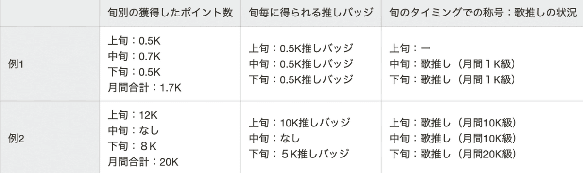 リスナーが獲得した各旬の推しバッジ及び歌推しによって推しptが上昇し最後に推しボーナスとして反映がされるようになっています。