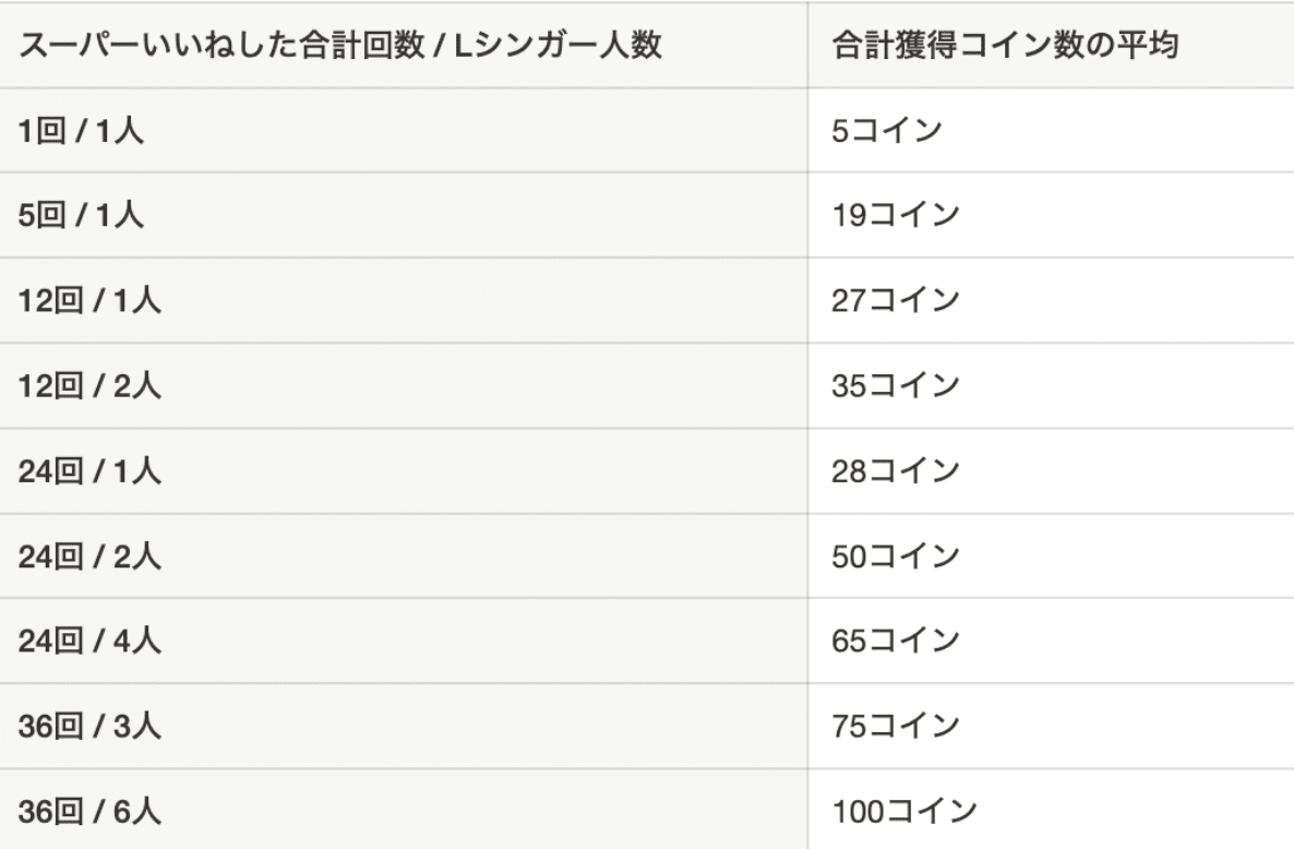 あくまで獲得したコインの50%が他枠でも使えるコインになるので、1枠で10コイン程度は投げてスーパーいいねを5回押して退出していただくとシンガーからの印象もよくなります。