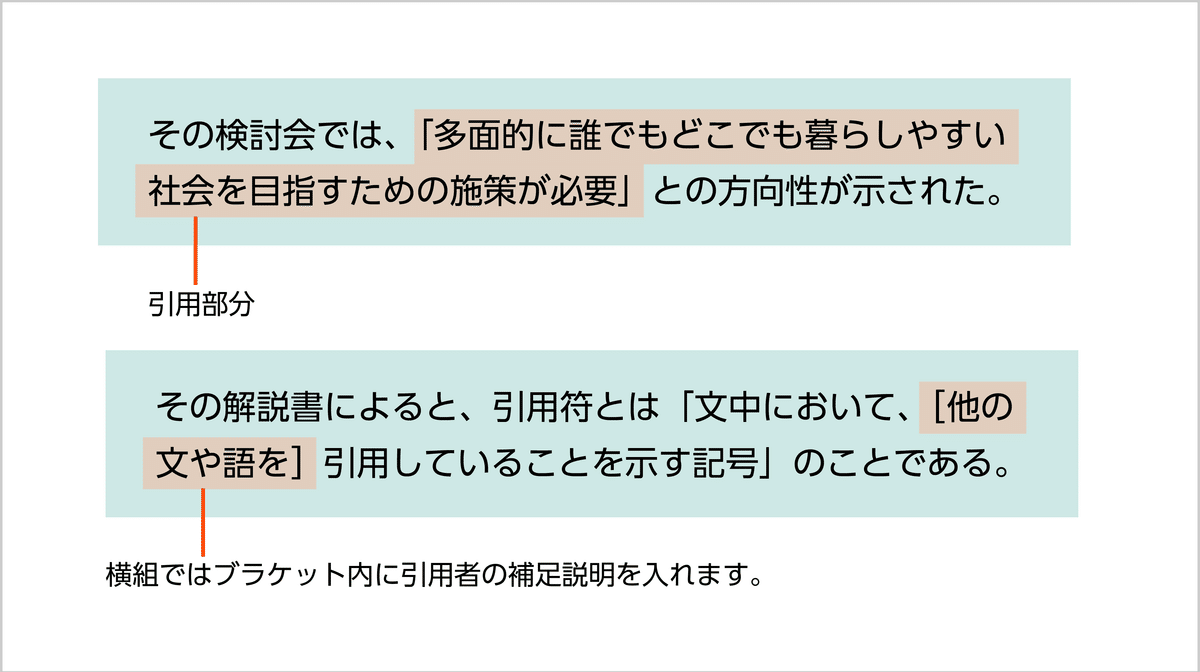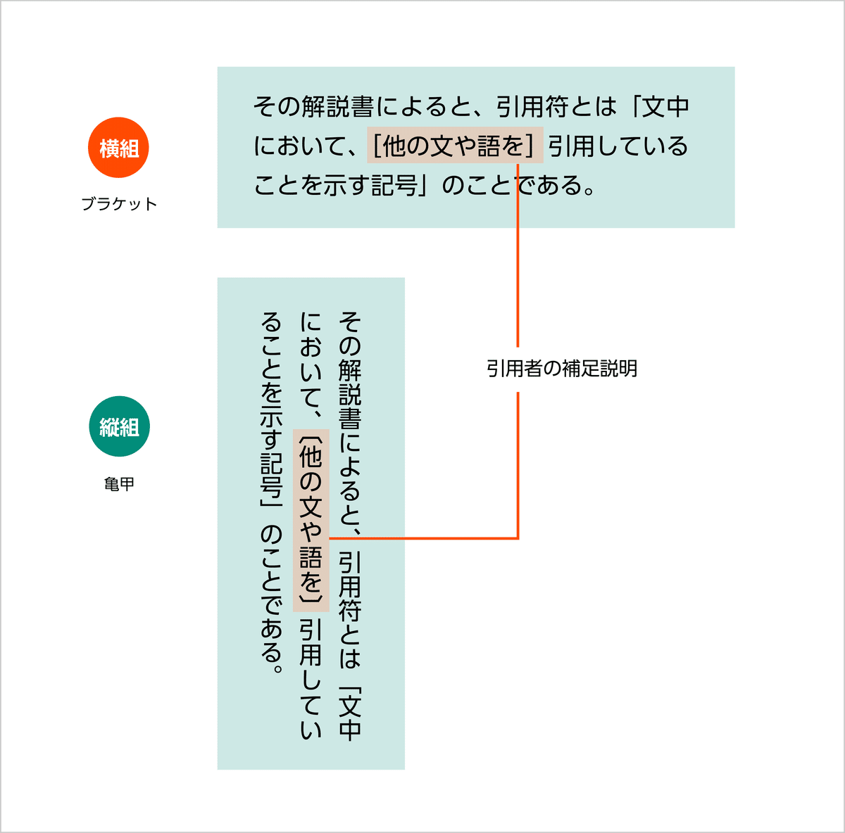 また引用文中に引用者の補足説明をつける場合、縦組では亀甲、横組ではブラケットを使用します。(詳しくは後述する「横組・縦組で異なる字形を使用する場合」の「ブラケットと亀甲」の項目をご参照ください)