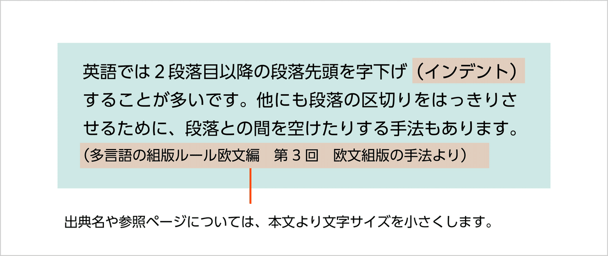 本文中に1行書きで補足説明をする「挿入注」にも丸括弧(パーレン)を使用します。出典名や参照ページなどについては、文字サイズを小さくすることで注記であることがより分かりやすくなります。