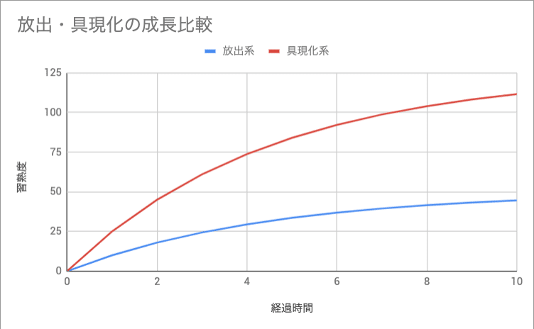 なんと! たった2年の修行で!Gさんの具現化能力は、10年修行した(苦手な)放出系に追いついてしまうのです!(学習の減衰率0.8倍と過程)