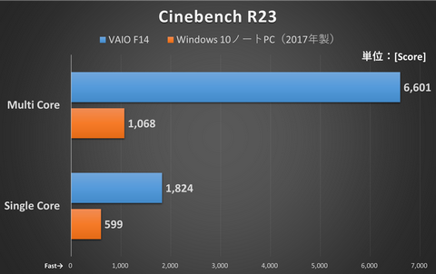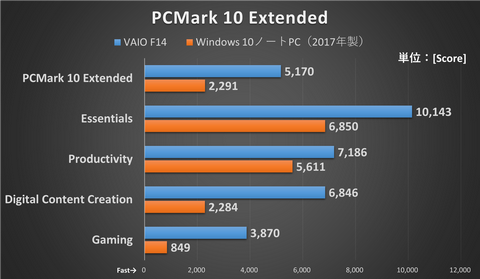 この結果を見ると、Windows 10ノートPCからVAIO F14に買い替えると、あらゆる用途で性能が爆上がりすると言っても過言ではない。なお、VAIO F14のスコアは現行のWindows 11ノートPCの中でもなかなか高い。長く使うという用途にも適している。