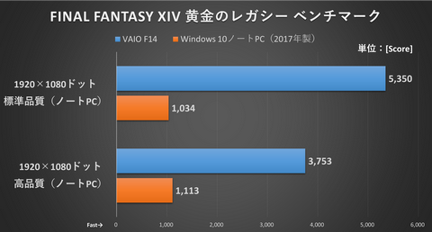 FINAL FANTASY XIV 黄金のレガシー ベンチマークも実行してみた。Windows 10ノートPCの内蔵GPUではさすがフルHDの標準品質でもまともにプレイできないスコアだが、VAIO F14の内蔵GPUはフルHDの標準品質では普通にプレイできるスコアとなっている。PCで軽くゲームを楽しみたいという用途にもVAIO F14は使えそうだ。
