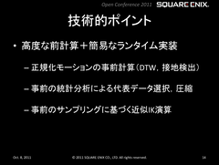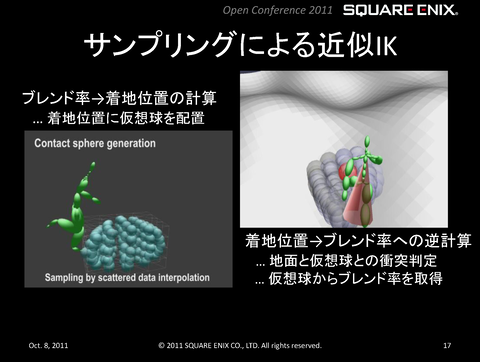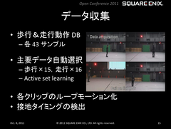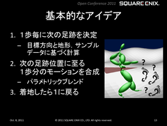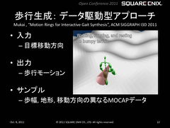 もっと実直なアプローチのフルボディIK技術もある。たとえば、スクウェアエニックスが、自社ゲームエンジンの「Luminous Studio」を開発した際に生み出された技術について紹介したカンファレンス「第1回 スクウェア・エニックス オープンカンファレンス」(2011年開催)では、同社独自のフルボディIK技術として「データ駆動型アプローチの歩行モーション生成」システムを発表していた。
