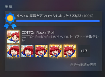 ![]() セガのALL.Net P-ras MULTI筐体に配信されてる ということで、練習用にSTEAMで購入しました。 コットン ロックンロール です。 実に華やかなゲームで、全編ボイス演出などが賑やかで楽しい。 一部のボス以外はえぐい弾幕も無く、対処法を積み重ねて行くと すいすい進める古き良き覚えシューの色が濃い。 ゲーム進行度でアンロックされるステージも多く、 選択でいくらでも緩くなるし、コンテニューゴリ押しクリアも可能。 自機の種類も多く、自機によってショットや特殊が大きく異なり 驚くほどプレイ感も激変する。ほぼ別ゲーだ! ストーリーモードのステージ間のデモもよく出来ていて、 フルボイスによるキャラの掛け合いが緩くて楽しく、 リミテッドなアニメーションの見せ方も良い。 こういった感じで非常に贅沢かつゴージャスな造り。 はじめれば誰しもが笑顔になるだろう。 その一方、初見殺し上等なステージがあったり、 ラスボスの弾幕がえぐかったりするので、選ぶルートによっては ハード以上で1CCはなかなか難しい。 ライトにもコアにも満足できる、 これぞ全国流通のコンシューマーな造りである。 その気になればいくらでもコアに楽しめる。 ![]() 本作は全体的に絵面が奇麗で可愛らしいが、 特に目を引くのがステージスタート時の自機キャラのアップになった アニメーションだろう。 このインパクトが凄く、一瞬にしてプレーヤーを虜にしてくる。 全キャラ分造り込まれてて、これだけでも本作の価値があると言えるだろう。 ![]() とりあえず実績コンプまでやり込んだ! テクニックを要する内容でもないので時間さえかければ 誰でもコンプできる、めちゃくちゃ優しい。 全体的によくできてて、間口の広さにめちゃくちゃ感心した。 これはアーケードで1CC目指して練習を重ねて行きたい。 #