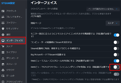去年からSTEAMを使いだし、 ゲームプレイ中以外のゲーム探しやコミニュティチェックで STEAMアプリが頻繁に落ちては立ち上がるを繰り返してたので、 込み入った物色の時はかなり困ってました。 PCのスペックや相性の問題かと思ってたんですが、 先日あっさり解決したのでその解決法を記しておきます。 結論から行くと、STEAMアプリの初期設定と うちのPCとの相性がよくなかったみたいです。 設定をちょっといじれば、もしかすると自分と同じ症状の人も 直るかと思います。 ![]() まず STEAMメニューの左上 【STEAM】をクリックし 出てきた項目の中から 【設定】をクリック。 ![]() 出てきたウインドウの左の項目【インタ-フェース】をチェック。 右の内容一覧の中で 【WEBビューでGPUアクセラレーションレンダリングを有効にする】 を無効にする。 すると再起動を求めてくるので、再起動すると完了です。 これでうちのPCで落ちる事が無くなりました。 たぶん貧弱なグラフィックボードか妙な設定のディスプレイアダプタとか 使ってるPCがこういう症状になるのかもしれない。 頻繁に落ちる方は是非お試しあれ。 もし効果がなくても、最後のGPUアクセラレーションを有効にすれば 設定は元通りです。 #