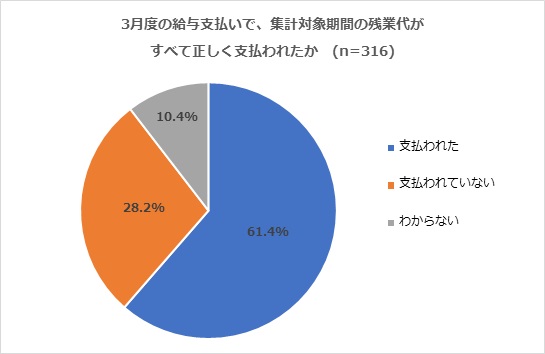 この1月の指示に対して、本調査回答者 316 名のうち約 3 割にあたる 89 人が「残業代がすべて正しく支払われたか」という問いに対して、3月になってもなお「支払われていない」と回答しました。