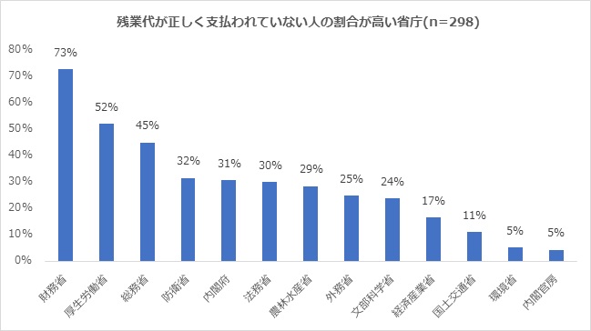 「3月度の給与支払いで、残業代がすべて正しく支払われたか」という問いに対して、「支払われていない」と回答した人の割合を省庁別に比較したところ、最も割合が高かったのは財務省(支払われていない73%、支払われた27%)、厚生労働省(支払われていない52%、支払われた39%、わからない9%)、総務省(支払われていない45%、支払われた45%、わからない10%)でした。正しく支払われていない人数で見ると最も多かったのは厚生労働省でした。最も正確に支払われていたのは環境省(支払われていない5%、支払われた90%、わからない5%)と内閣官房(支払われていない5%、支払われた86%、わからない9%)でした。