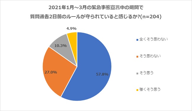 そこで本調査においては、「2021年1月~3月の緊急事態宣言中の期間で質問通告2日前のルールが守られていると感じるか」を聞いたところ、85%がそう思わないと回答しました。(「全くそう思わない(57.8%)」「そう思わない(27.0%)」「そう思う(10.3%)」、「強くそう思う(4.9%)」)