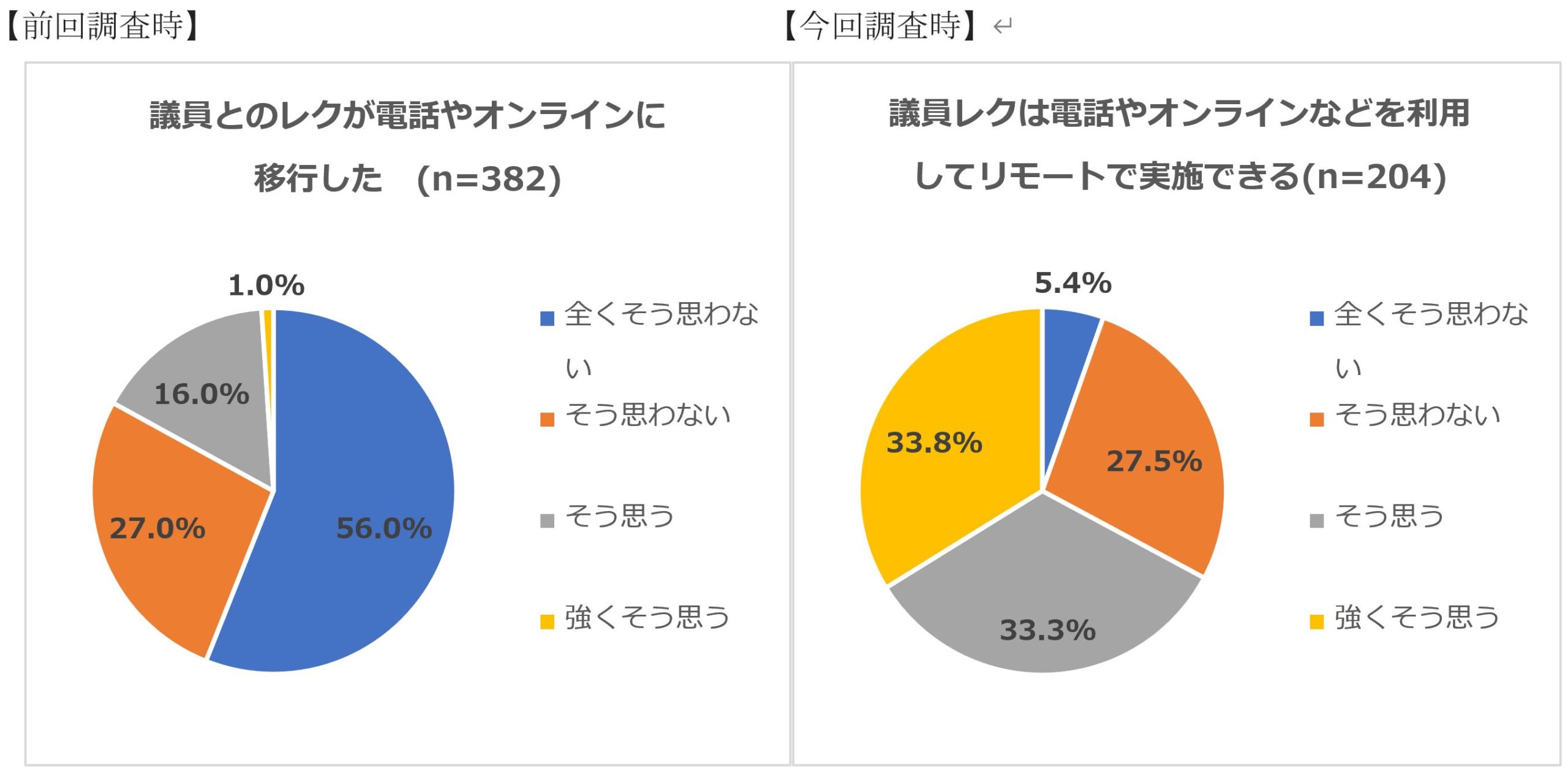 ●「議員とのレクは電話やオンラインなどを利用してリモートで行うことができる」という問いに対し、前回調査と今回調査を比較すると、ポジティブな意見である「強くそう思う」「そう思う」が17.0%から67.1%へと増加しました。