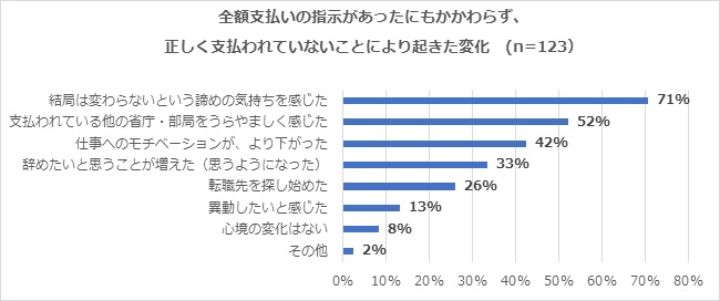 7.残業代不払いに「諦め」71%、「モチベーション低下」42%、「転職先探し」26%