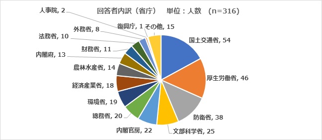 省庁別回答者内訳は、国土交通省 54 名(回答者中 17.1%)、厚生労働省 46 名(同 14.6%)、防衛省 38 名(同 12.0%)、文部科学省 25 名(同 7.9%)、内閣官房 22 名(同 7.0%)、総務省 20 名(同 6.3%)、環境省 19 名(同 6.0%)、経済産業省 18 名(同 5.7%)、農林水産省 14 名(同 4.4%)、内閣府 13 名(同 4.1%)、財務省 11 名(同 3.5%)、法務省 10 名(3.2%)、外務省 8 名(同 2.5%)、人事院 2 名(同 0.6%)、復興庁 1 名(同 0.3%)、その他 15 名(同 4.7%)、となっています。省庁別の比較の際には、回答者数の少ない人事院・復興庁・その他は除外しています。