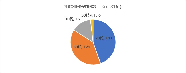 年齢別回答者内訳は、20代141 名(回答者中 44.6%)、30代 124 名(同 39.2%)、40代 45 名(同 14.2%)、50代以上 6 名(同 1.9%)となっています。20代、30代の回答者が多い理由については様々な理由が考えられますが、20代、30代の利用者が多いSNS等でアンケートが拡散されたことの他、特に若手~中堅層の課題意識が強いこと、残業代についての調査として打ち出したことから、残業代の対象ではない年齢層が回答を控えたことなどが推察されます。