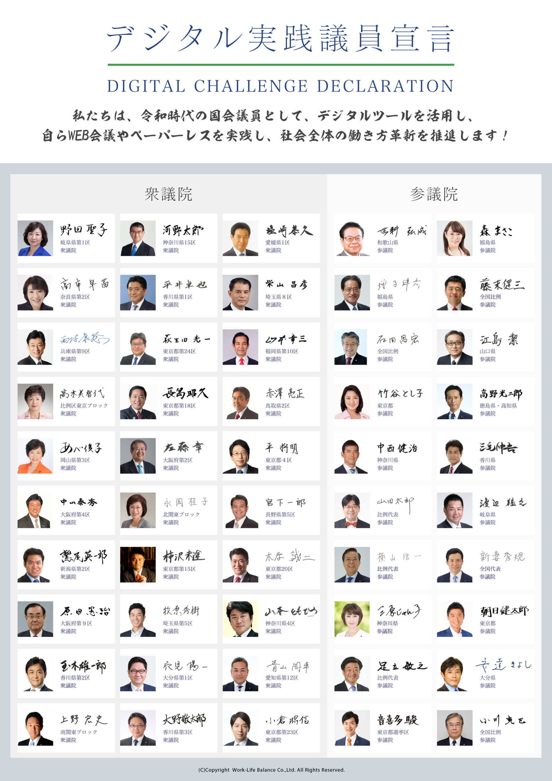 当社実施の前回調査及び本調査で明らかになったとおり、国家公務員の働き方は国会議員の働き方に大きく影響を受けます。そこで、当社では全国会議員を対象に2019年より『デジタル実践議員宣言』を募集しており、2021年4月22日現在、宣言者は86人にのぼりましたので、以下に公開します。
