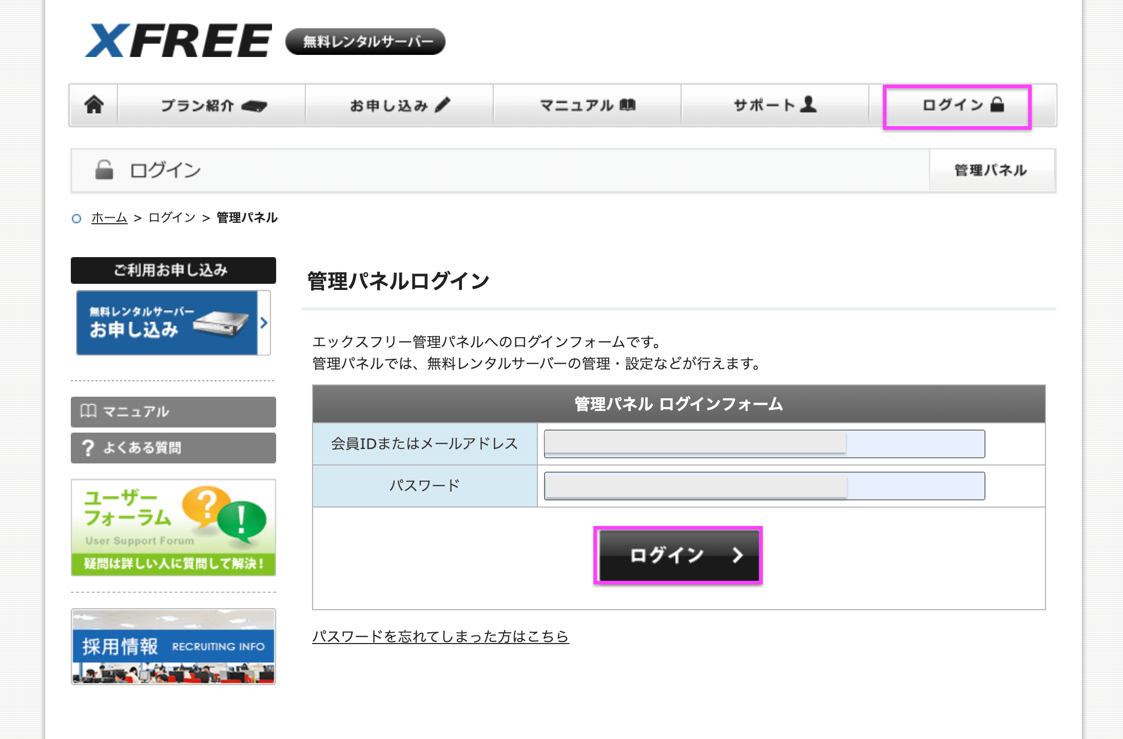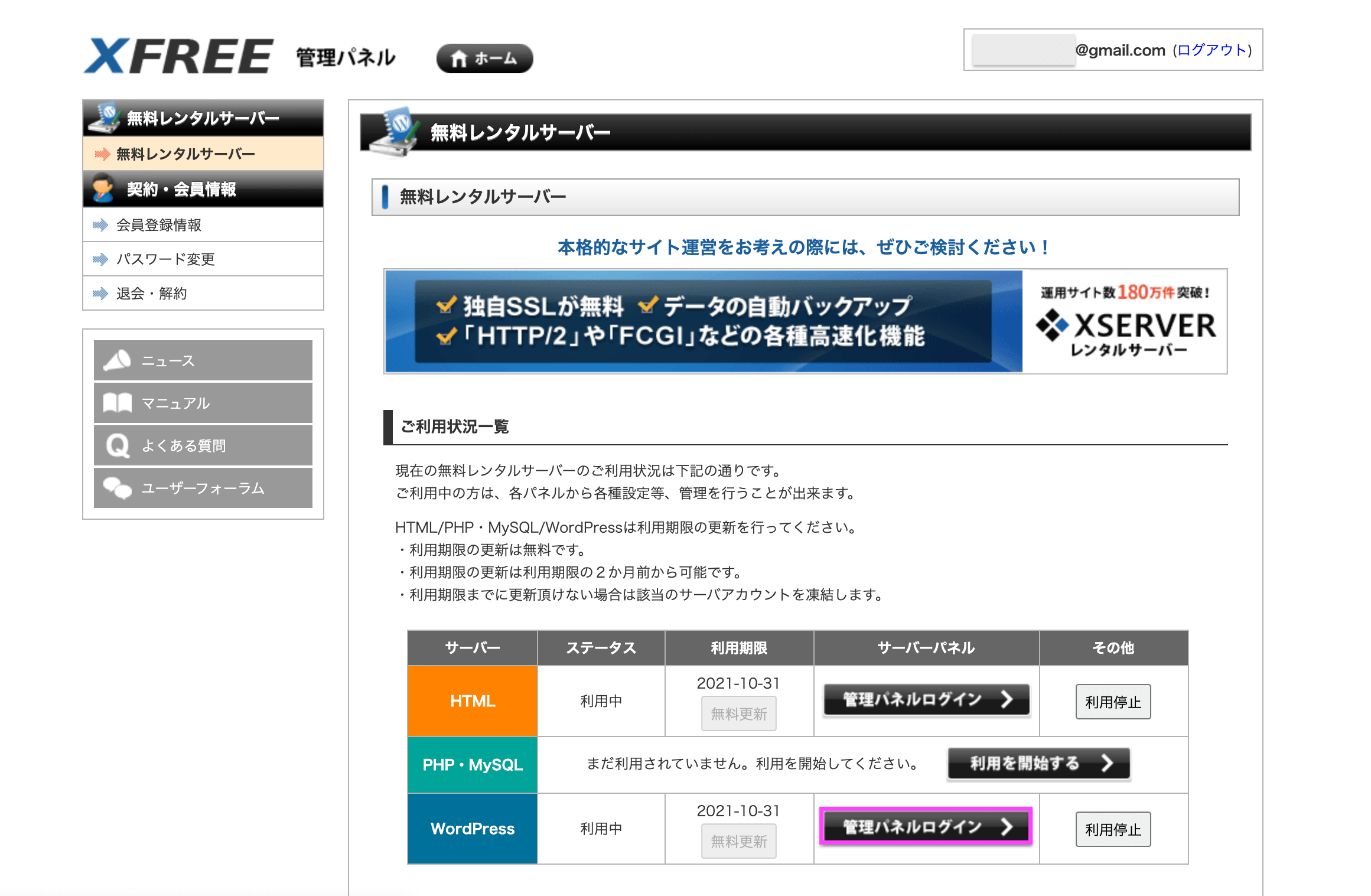 まずは、XFREEサーバーにログインしましょう。