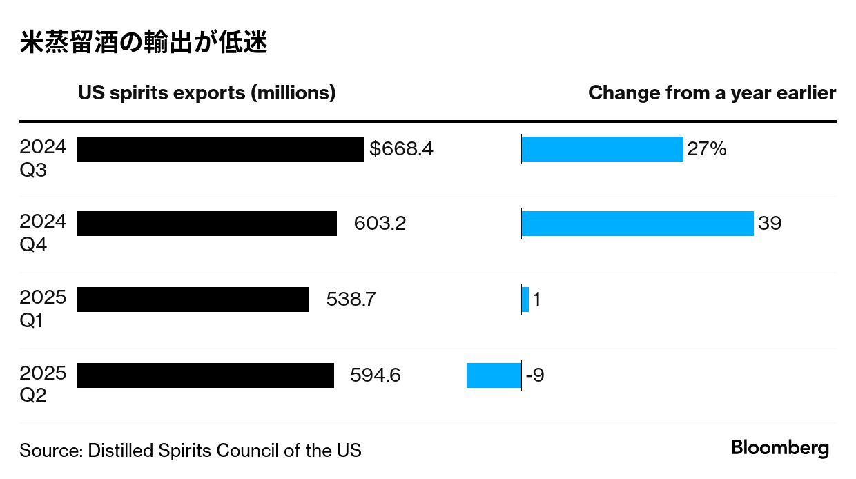 米蒸留酒協会のクリス・スワンガー最高経営責任者(CEO)は声明で、「持続的な貿易摩擦が、米蒸留酒輸出に即時の悪影響を及ぼしている」と指摘。