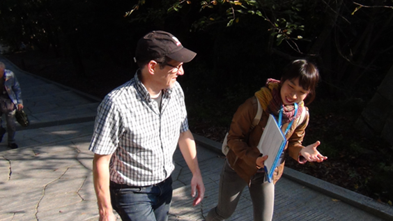 短期的には、一回一回の授業で学生から得られたフィードバックをもとに、次の授業では、〇〇を取り入れてみようとか、長期的には、学期・年度単位での英語教育プログラムを企画して、△△というスキルを学生に身につけてもらおうなど、考えたことを比較的に早く、具体的に実践に移す・生かすことができるという特徴があります。新型コロナウイルス感染症感染拡大のために、実施できない時期もありましたが、近年では、教室を飛び出して、地元松山を英語で観光案内しようというプロジェクト型の英語教育プログラムを企画・開発しました。実はこの企画の発案は、「もっと英語を使う環境があればよいのになぁ」というある学生さんからのコメントがきっかけでした。英語教育では、様々な教授法が提案されているのですが、その中の一つにこのプロジェクト型というものがあります。教科書で英語を学ぶという受動的な方法ではなく、何らかのプロジェクト(ここでは、英語で観光案内をすること)を通して、英語を使いながら学ぶという能動的で、発信型の英語学習を促すものです。幸運なことに、松山とその周辺には、観光の名所がたくさんあり、外国からの旅行者もたくさん来られています。こうした観光客の皆さんに、英語で観光ガイドができるような授業があれば、先ほどの学生さんのように英語を使いたいというニーズに応えることができるのです。