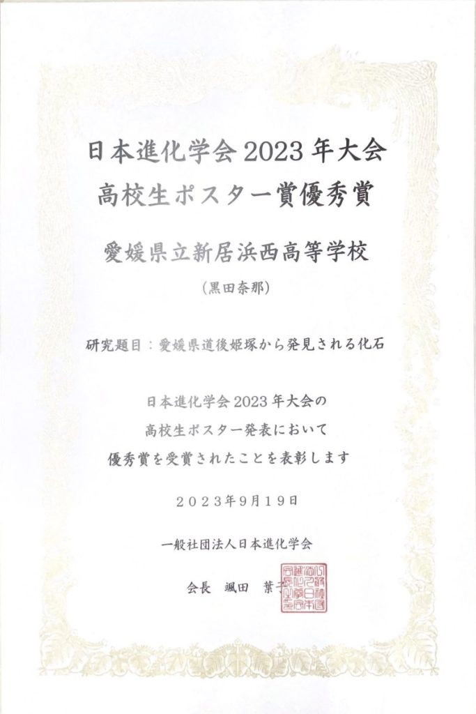 令和5年9月2日、「日本進化学会第25回大会(沖縄大会)」の「第17回みんなのジュニア進化学」において、四国型次世代科学技術チャレンジプログラムを受講した高校生3人がそれぞれ研究発表を行いました。そのうち、黒田奈那さんが優秀賞を、加藤美佳さん、重川富侑子さんが敢闘賞を受賞しました。