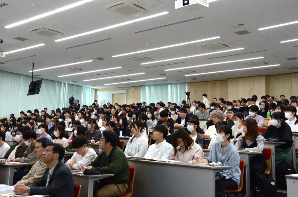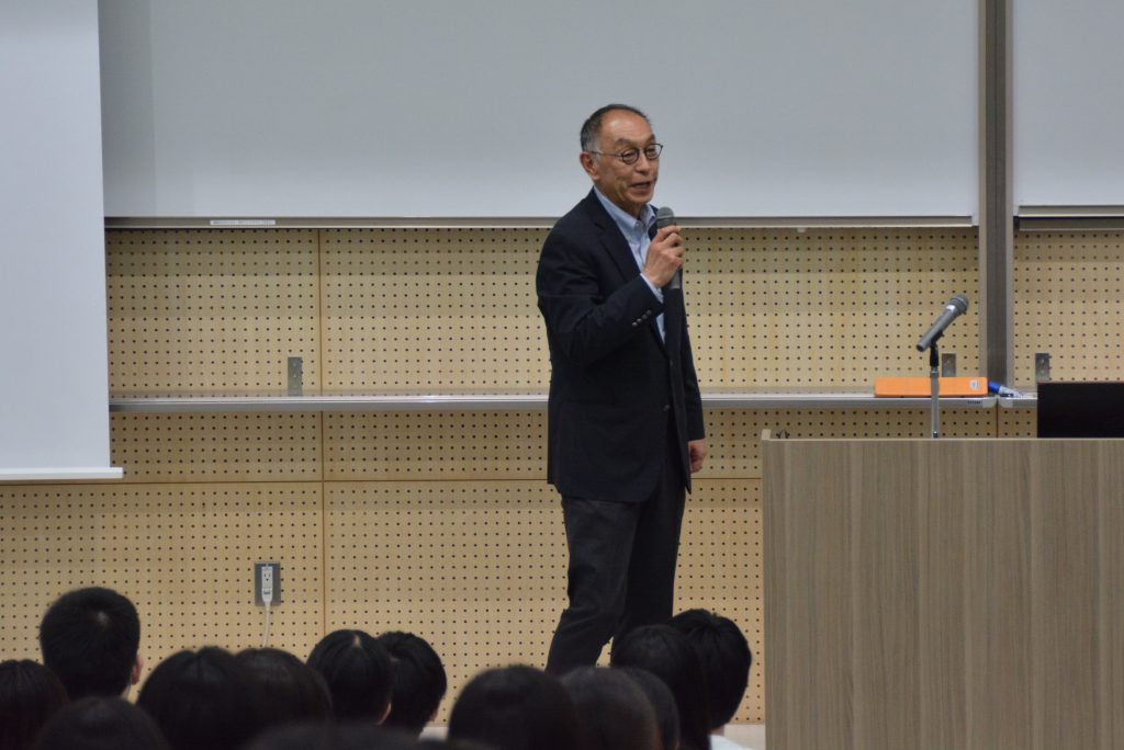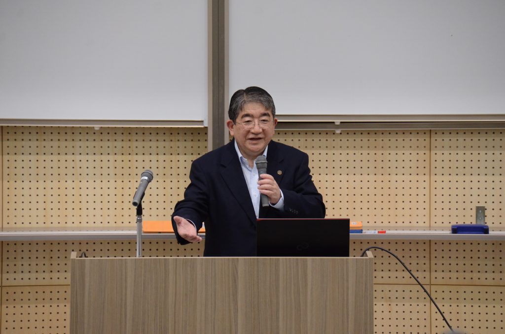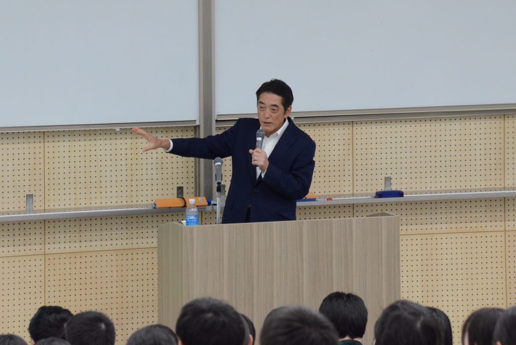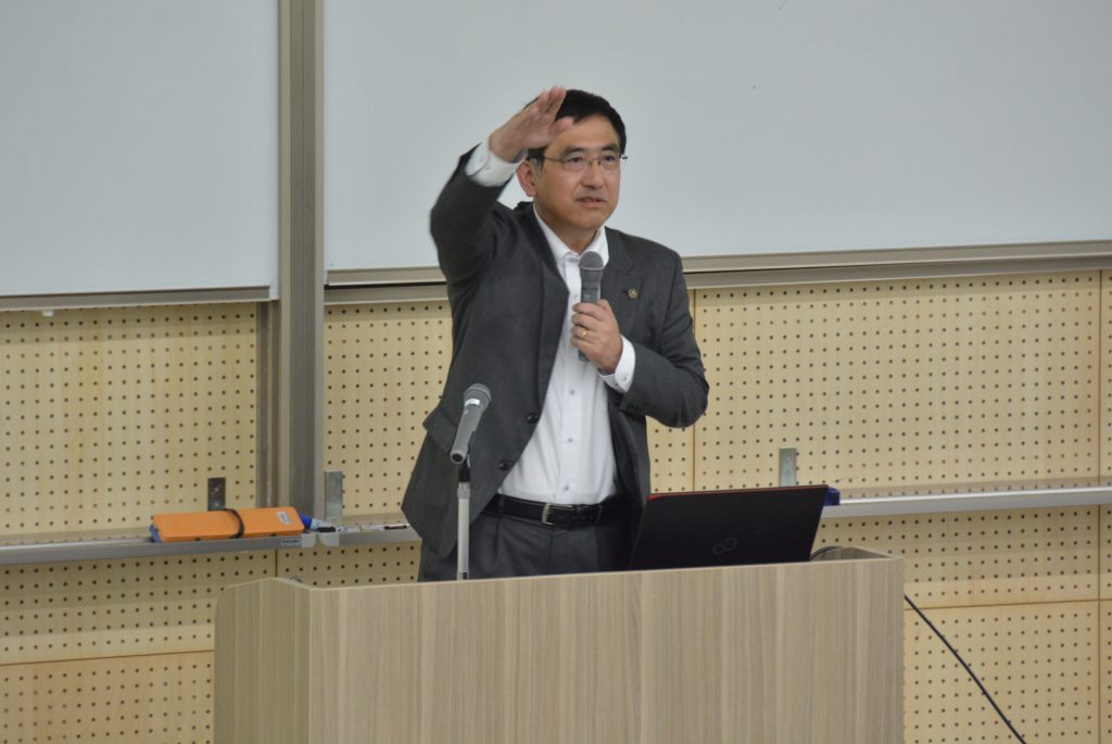 まず、仁科学長から、「全世代対応型の『地域における知の拠点』としての多機能化」と題して講演があり、大学を取り巻く環境が著しく変化し、求められる機能が多様化していることに触れた上で、「愛媛大学が愛媛県の若者定着に貢献していること」、「大学入学前から、そして、社会に出てからも学び続ける場として愛媛大学があること」、「価値観が大きく変容する社会の動きをいち早く察知し、愛媛大学も常に改革し続けていること」などを学生に伝え、実際に、本年4月に大幅な全学機構の再編を行ったことを紹介しました。