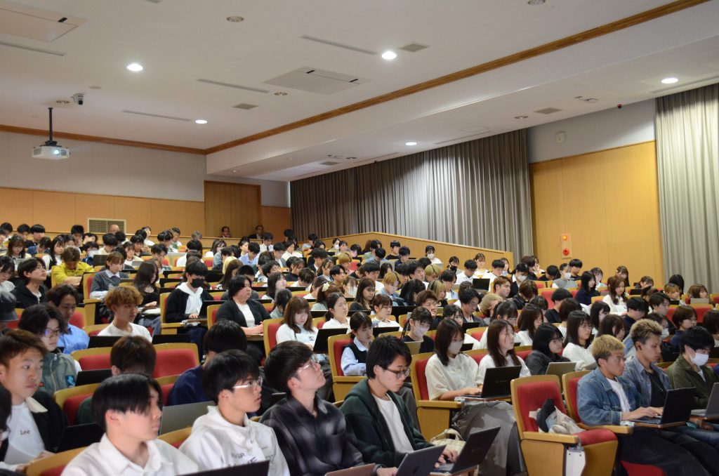 令和6年5月15日(水)、愛媛県・愛媛大学連携シンポジウムを開催しました。このシンポジウムは、急速かつ深刻な人口減少を迎える中で、愛媛県の魅力や地域活性化に向けた愛媛県や愛媛大学の取組を学生に知ってもらい、若者の愛媛県定着の契機とすることを目的として開催したものです。約500人の学生(本学以外の学生15人を含む)が、メイン会場であるグリーンホールと同時オンライン配信会場である南加記念ホールに分かれて受講しました。