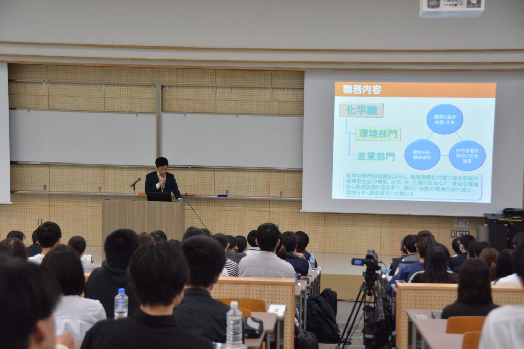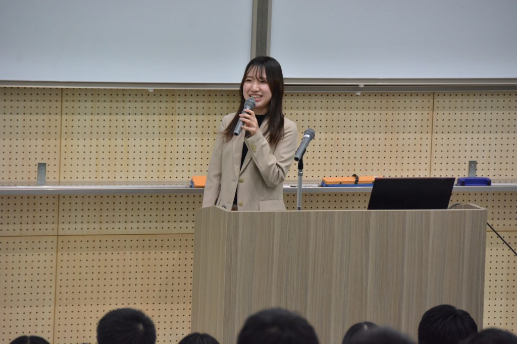 第2部では、まず、本学の卒業生であり、現在、愛媛県庁で働いている若手職員6人から、中村知事から紹介のあった内容も踏まえつつ、愛媛県で働くことにした動機や実際に愛媛県で働いて感じたこと、仕事のやりがい、ワーク・ライフ・バランスなどについての紹介があり、学生にとっては、行政職から各種技術職まで、幅広い職種の体験談を聞くことができる機会となりました。