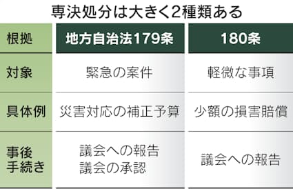 乱用はできない。地方自治法179条は「特に緊急を要するため議会を招集する時間的余裕がないことが明らかであると認めるとき」と条件を明示している。あくまで例外というのが法的な位置づけだ。これとは別に、議会からのあらかじめの委任に基づく「軽易な事項」の専決処分も地方自治法180条が定めている。比較的少額の損害賠償や契約額の変更などが典型だ。