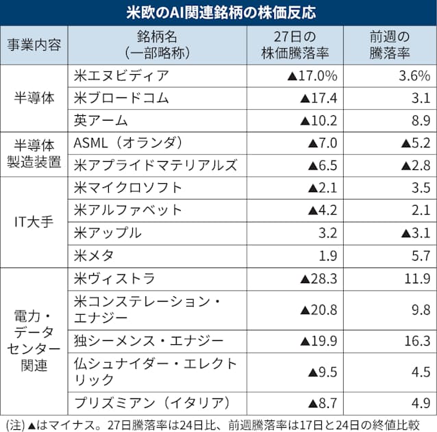 米電力大手コンステレーション・エナジーも株価が2割強下げるなど、幅広い銘柄に売りが広がった。同社は、原子力発電所の発電能力をデータセンター向けに長期提供すると発表し、AI関連銘柄の一角としてこれまで買われてきた。