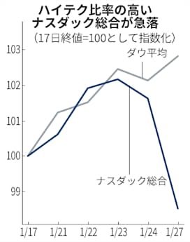 ハイテク株の比率が高いナスダック総合株価指数は3%下落し、約1カ月ぶりの下落率となった。ナスダック上場企業全体では27日に時価総額が1兆ドル(約154兆円)以上消失した。エヌビディアだけでみても時価総額が約5900億ドル(91兆円)減少。米ブルームバーグ通信によると単一銘柄の1日の時価総額減少額として史上最大という。
